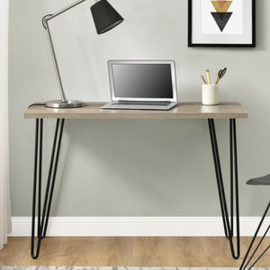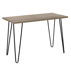 • Made from laminated particleboard and metal hairpin legs, the medium brown woodgrain finish matches the black legs for an industrial look