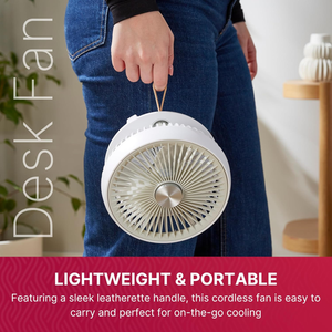 • The Dimplex Cordless Desk Fan is the perfect solution for powerful cooling in a compact and stylish design. With four adjustable wind speeds, you can customize the airflow to your exact preference, providing a refreshing breeze wherever it's needed. Built with ultimate portability in mind, this fan conveniently folds flat for easy storage, and its sleek leather carry strap makes it effortless to take with you whether you're at home, in the office, or on the go.